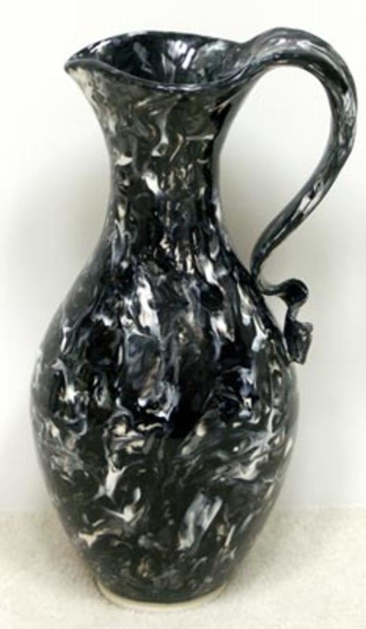 This 13-inch pitcher is covered with black, gray, and white glazes that create a marbled effect. The handle rises above the neck of the pitcher and then, as it descends, it forms several ripples and curves before it fuses with the body.
